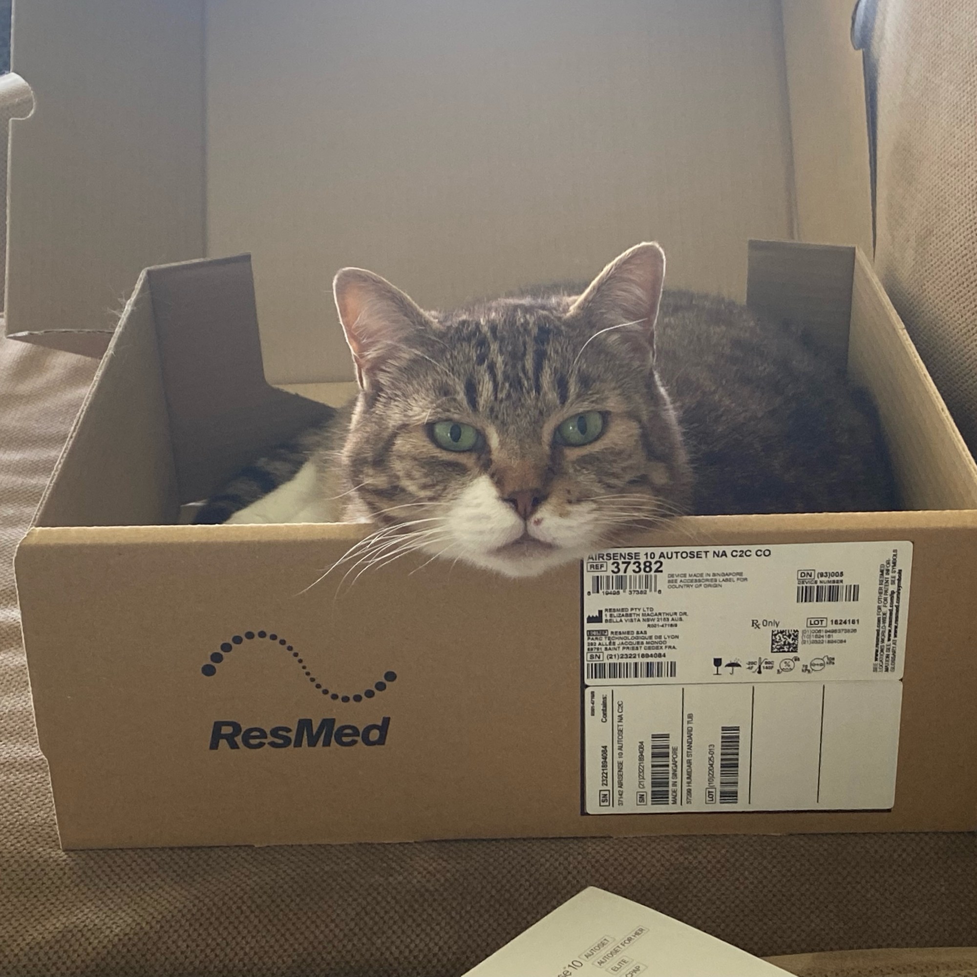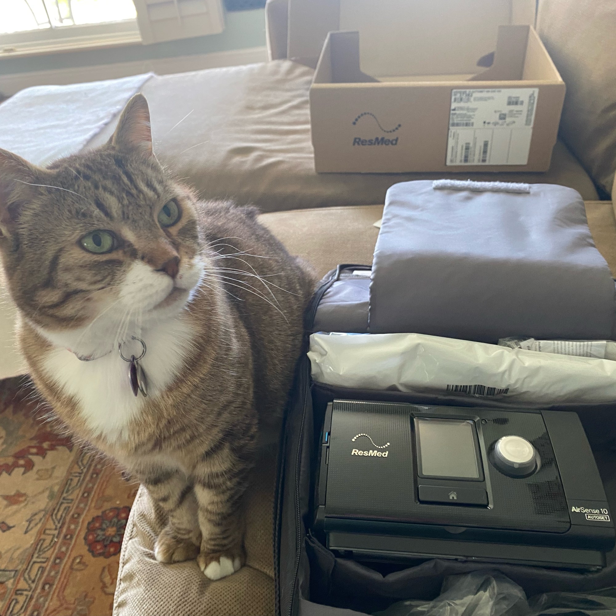 I received the mask and tubing the next week, which wasn’t helpful since I couldn’t even use it, but I patiently waited and waited and waited until finally 6 weeks later the machine arrived. Naturally, the box was usurped by the chief box inspector within minutes.